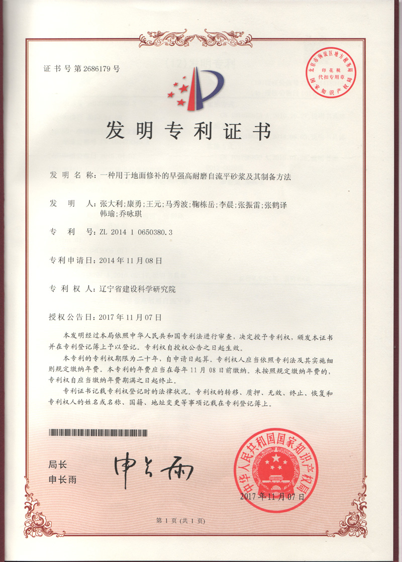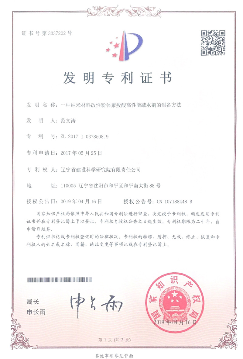 证书---一种纳米材料改性粉体聚羧酸高性能减水剂的制备方法